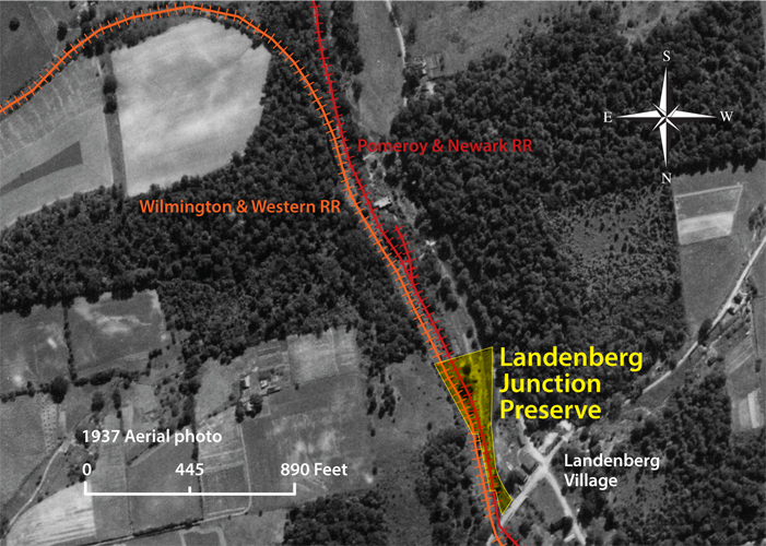 The map on the right shows the Landenberg Junction Preserve in the perspective of 1937 when the railroad beds are apparent.