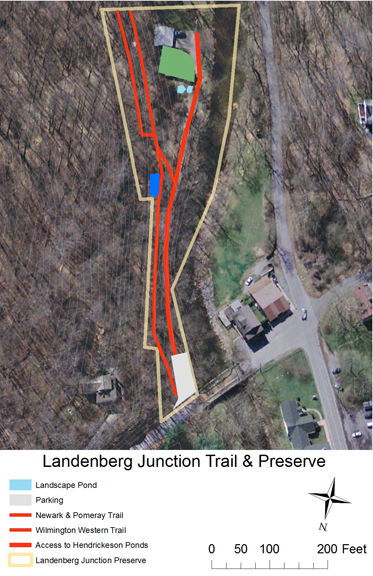 The Landenberg Junction Trail is part of the expanding New Garden Trail system. The trail is located in an exceptional natural area known for its rich bio-diversity of plants and animal life. Situated on a steep eastern hillside along the White Clay Creek National Wild and Scenic River it descends to a flat habitat garden of native plants marking the former Hendrickson's house. Three short paths totaling less than a mile comprise the trail. Walking them conveys a sense of area's history, the mills, the railroads and its former resident, the Hendrickson family. Two parallel paths offer a feel for what it was like "to be there" when Pomeroy & Newark RR line and the Wilmington & Western RR line serviced Landenberg. A raised platform with an interpretive sign provides a visual perspective of the bustling mill town of Landenberg and its railroads during the late 19th and early 20th centuries.<\n>