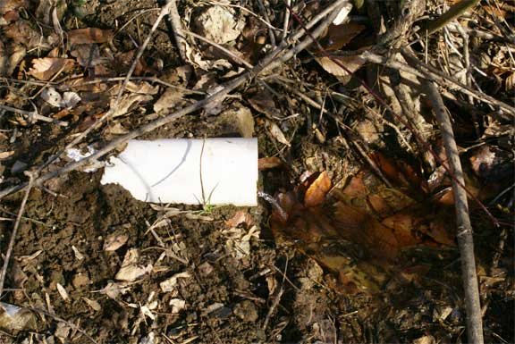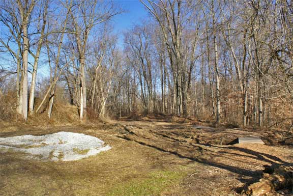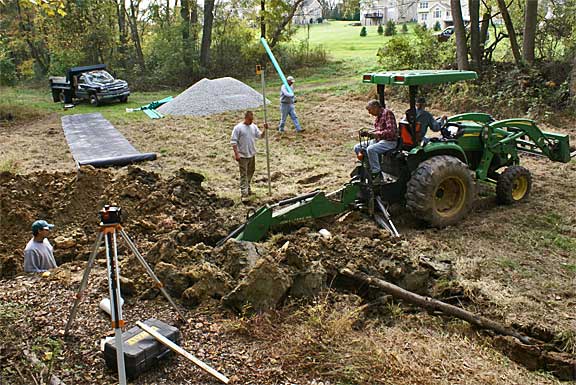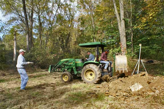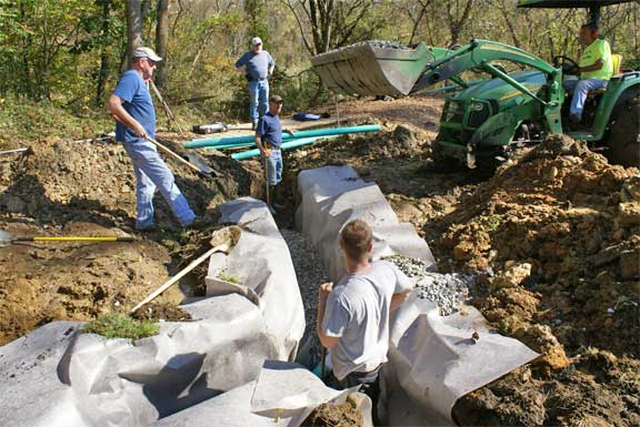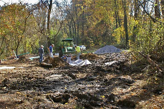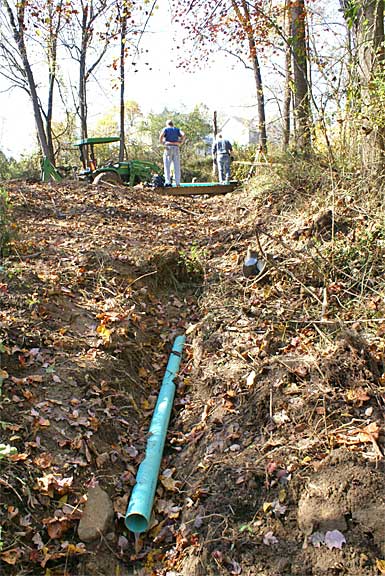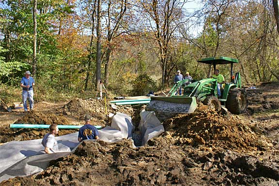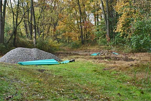 The main trail runs on top of the former Pomeroy-Newark railroad. Along one section of this old railroad bed several springs surface creating an impassible area for walkers and mobile equipment (left image). Two small footbridges were constructed by volunteers in 2011 (right image). In October of 2012, several Friends of the Trails volunteers assisted Rickerman Tree Service to redirect the springs away and underneath the trail. Photos (below) of the completed project show perforated pipes being carefully situated in lined ditches covered with stone to channel spring water away from the trail.