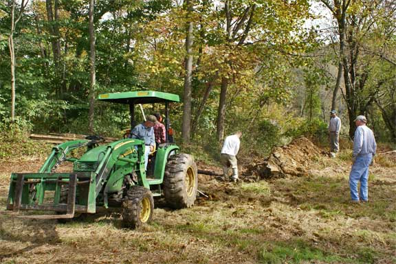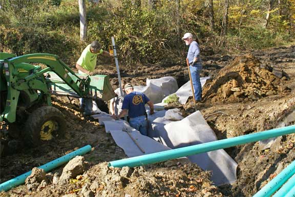 The main trail runs on top of the former Pomeroy-Newark railroad. Along one section of this old railroad bed several springs surface creating an impassible area for walkers and mobile equipment (left image). Two small footbridges were constructed by volunteers in 2011 (right image). In October of 2012, several Friends of the Trails volunteers assisted Rickerman Tree Service to redirect the springs away and underneath the trail. Photos (below) of the completed project show perforated pipes being carefully situated in lined ditches covered with stone to channel spring water away from the trail.